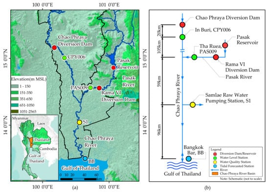 Map and schematic of the study site. (a) Geographic details of the lower Chao Phraya area, and (b) the schematic of the related measurement stations in this study.