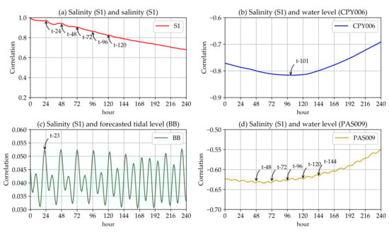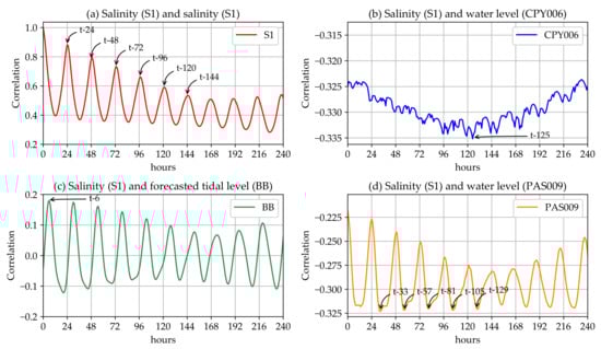The cross-correlations between S1 and various variables for the low water level case: (a) the auto-correlation of S1; (b) the cross-correlation between S1 and CPY006; (c) the cross-correlation between S1 and BB; and (d) the cross-correlation between S1 and PAS009.