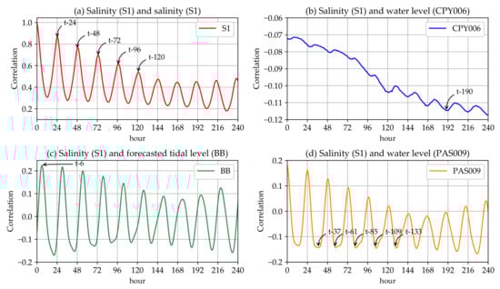 The cross-correlations between S1 and various variables for the high water level case: (a) the auto-correlation of S1; (b) the cross-correlation between S1 and CPY006; (c) the cross-correlation between S1 and BB; and (d) the cross-correlation between S1 and PAS009.