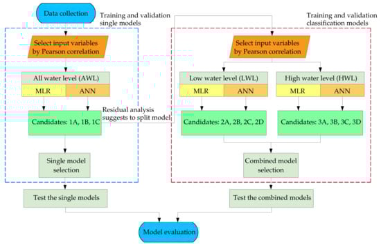 We started developing models by using a simple MLR approach. Parameters were used according to candidates shown in Equation (1)–(3). The residuals from the trained models, which were the differences between the measurements and the forecasts, were graphically investigated (residual analysis). An MLR model assumes a linear relationship between the target variables and the predictor variables and works best when the residual is equal across all values of the independent variables. If the residual is highly heteroscedastic, it means the variability of a residual is unequal across the range of values of a variable that predicts it. In this case, the variability of the residuals was high when the water level at CPY006 was low and vice versa (See details in Appendix A). Hence, it indicated that the model could be consistent when the values of predictor variables were high, but it was highly inconsistent in accuracy when the values of predictor variables were low. To overcome this inconsistency, we proposed the use of two separate sub-models for forecasting: one when the water level was low and another when the water level was high. From observation of the residuals, the water level at CPY006 was a good model splitting boundary between the two sub-models. Therefore, the first sub-model explored was employed when the water level at CPY006 was lower than 4.0 m above mean sea level (MSL), that is, a low water level case (LWL) and the second sub-model was employed when the water level of CPY006 was higher than 4.0 m MSL, that is, a high water level case (HWL). The accuracy of the proposed combined-model method was investigated and compared with the single-model method afterward.