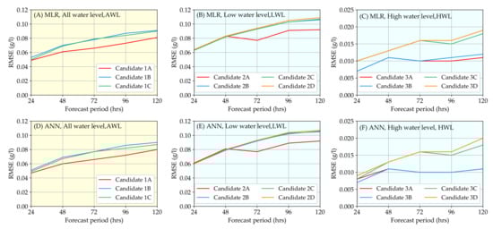 The model performance was compared to select the best candidates for both the single model and the combined model using the RMSE as the performance indicator. In the single-model case, candidate 1A outperformed candidates 1B and 1C as the RMSE from candidate 1A was lower at all times of the forecast. This was also true with both the MLR or the ANN. In the LWL case of the combined model, candidate 2A yielded the lowest RMSE among other candidates regardless of fit type (MLR or ANN). In the HWL case of the combined model, candidates 3A and 3B provided almost identical RMSE, which was lower than that of candidates 3C and 3D.