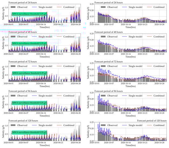 The continuous forecast as a result of model testing is illustrated in Figure 7. While the continuous forecast was carried out using both the ANN and the MLR, Figure 7 showed the forecast through the ANN model candidates in Table 1 as they performed slightly better than the MLR. Missing data were observed occasionally in the testing period. Subplots on the left column represent the continuous forecast on April 2020, while those on the right column represent October 2020. The time of forecast varied from 24 h to 120 h from top to bottom. Each subplot consists of the observed salinity, the forecasts using the single model and the forecasts using the combined model. Overall, the accuracy of the forecast decreased as the time of forecast increased. This agreed with the results from model validation. On April 2020, at 24–48 h forecast period, the combined model was able to capture high peaks of salinity slightly better than the single model. However, when the time of forecast was longer, the combined model sometimes forecasted peaks which were not observed in the real data. On October 2020, at 24–48 h forecast period, both models performed similarly. Nevertheless, as the forecast period increased, the forecasts from the single model fluctuated, which was inconsistent with the real data.