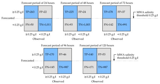 Confusion matrices for salinity forecasted by using the selected ANN combined model with forecast periods from 24 h to 120 h.