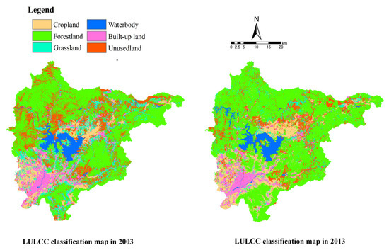 A slight soil erosion level was found for water bodies (approximately 71.75% and 67.10% in 2003 and 2013, respectively), followed by built-up land and cropland. However, cropland and forest occupied the largest areas of 120.31 km2 in 2003 and 151.89 km2 in 2013. Water bodies and grassland covered the smallest areas, accounting for 72.45 km2 in 2003 and 24.58 km2 in 2013.