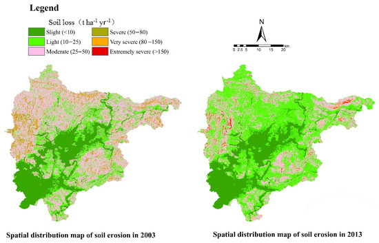 Annual soil loss erosion map of the study area in 2003 and 2013.