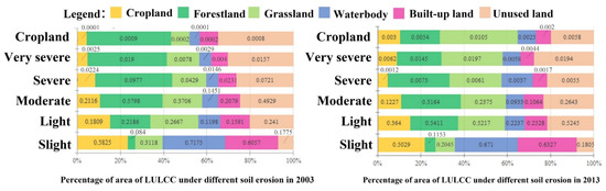 The transformation of land use is considered the primary cause of the change in soil erosion. To determine the role of each land-use type in the different types of erosion in the study area, the soil erosion maps were overlain by the different LULC maps for 2003 and 2013 by using the spatial analyst module in ArcGIS10.6 and ArcGIS zonal statistics. The statistical values of each land-use type and the soil erosion were specified, and the relationship between LULCC and soil erosion was revealed to estimate the soil erosion response to LULCC. The area percentage of land use under different soil erosion types is presented in Figure 5.
