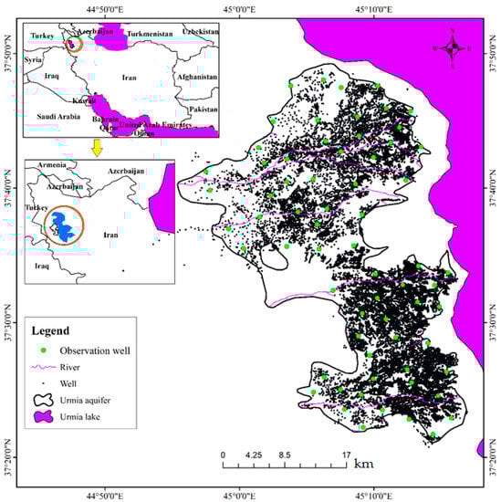 The Urmia aquifer (37°20′–37°50′ N, 44°50′–44°10′ E) is located in northwestern Iran along Lake Urmia, near the border of Turkey with an area of about 760 km2 (Figure 1). The aquifer is phreatic, with 64 observation wells and exploited by many production wells, which results in a 0.5-m drop in GWL every year. Thus, the storage of the alluvial aquifer of Urmia plain decreases by 15.1 million cubic meter (MCM) every year. The eastern part of the aquifer is of poor quality due to its border to Lake Urmia. About 70% of groundwater is used for agricultural purposes and the rest for drinking and industry. Due to the proximity of the GWL to the ground surface, groundwater evaporation is considerable, about 8 to 10 MCM per year. The average thickness of the aquifer is about 300 m in its center and 40 to 50 m at its margins. The climate of the area is cold and humid. Watersheds are fed by rivers, precipitation, and return water. The most important rivers in the area include Barandouz Chay, Nazlo Chay, Shahar Chay, and Roze Chay rivers. The general direction of groundwater flow is from west to east [44].