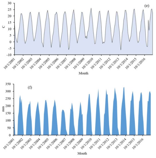 Monthly time series of observed variables from 2001 to 2017, (a) river flow, (b) groundwater withdrawal of observation well P1, (c) groundwater withdrawal of observation well P2, (d) precipitation, (e) temperature, and (f) evaporation.