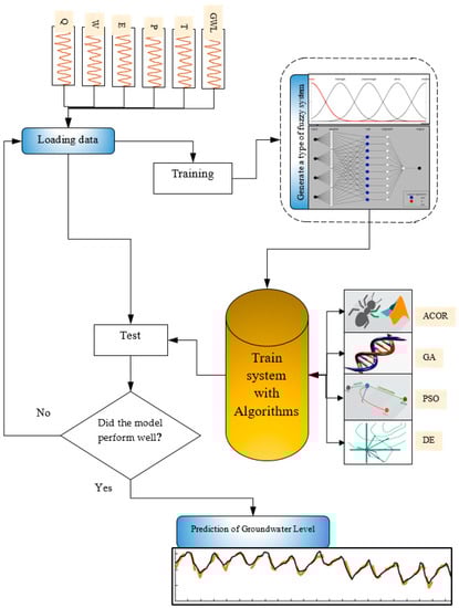 Along with the developed ANFIS model, several metaheuristic algorithms were used to train the ANFIS to develop hybrid models. According to the literature, each of these algorithms has unique features that can significantly improve the performance of the traditional ANFIS model [1,19,45,46]. The structure of ANFIS-metaheuristic algorithms hybrid models used in this study to predict GWL is depicted in Figure 5. Firstly, input patterns with different variables are given to the model, and then, the type of the fuzzy function and the ANFIS structure are determined. The developed ANFIS is trained with metaheuristic algorithms to improve results. Therefore, the objective function in this structure is to minimize the difference between the observed and predicted values. Finally, the GWL is predicted by the trained model. It should be noted that data were divided into two groups: about 70% of the data were used for training, and the rest were used for validation.