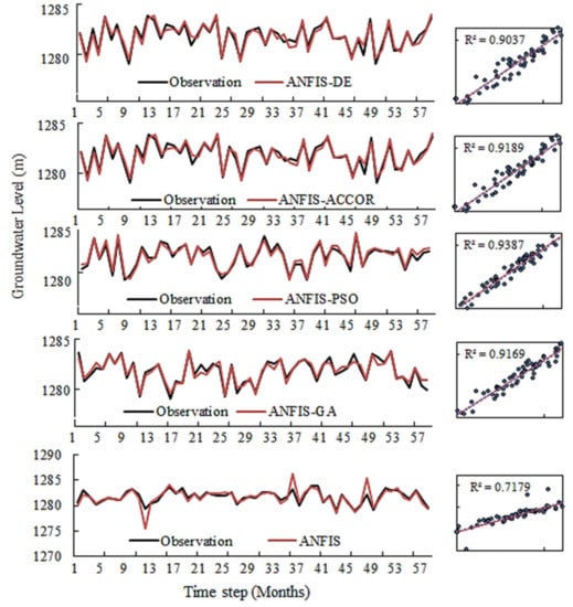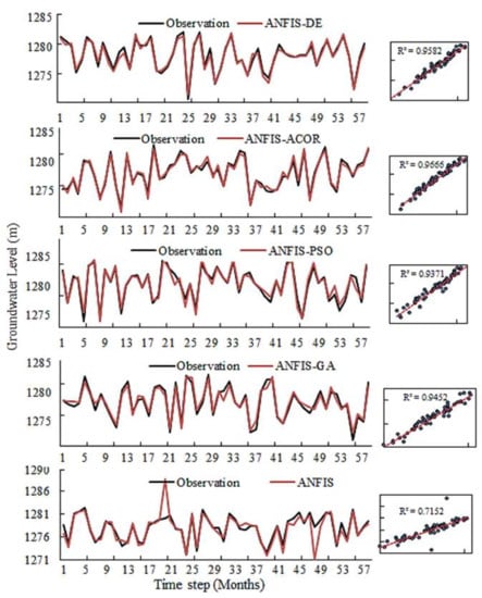 Observed and predicted test data are depicted in Figure 6 for observation well P1. The results of ANFIS show that, in some months, there is a large prediction error, which can be seen for time steps 13, 37, and 49. However, improved ANFIS shows acceptable results. This be seen in the scatter plots of the hybrid models with R2 values higher than 0.9.