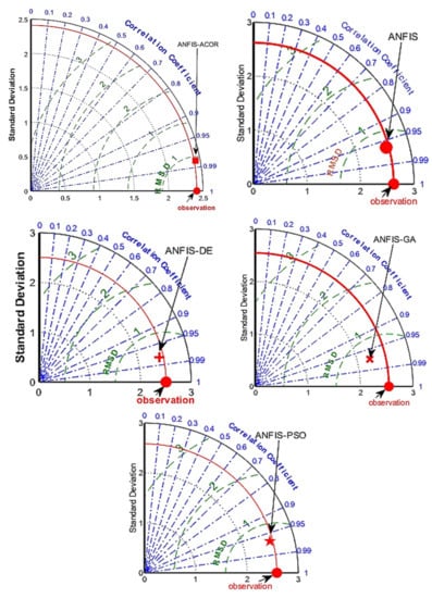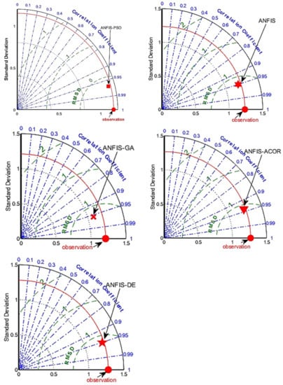 Taylor’s diagram of the selected input pattern of each model is depicted in Figure 7. The x and y axes indicate the standard deviation of the data. The quarter-circle arc shows the correlation coefficient of arbitrary and observation data, which varies from 0 to 1. The observation data lie on the x-axis, and predictions close to the x-axis indicate a strong correlation with observations. The green arcs indicate root mean square deviation (RMSD). The highest correlation with observations (>97%) was obtained using the ANFIS-PSO model. However, in other models, the correlation was lower than 95%. The standard deviation for the ANFIS-PSO model is equal to that of the observations. Results depicted in Figure 8, along with the previously obtained results, indicate that the ANFIS-PSO hybrid model leads to the best prediction performance compared to the other models.