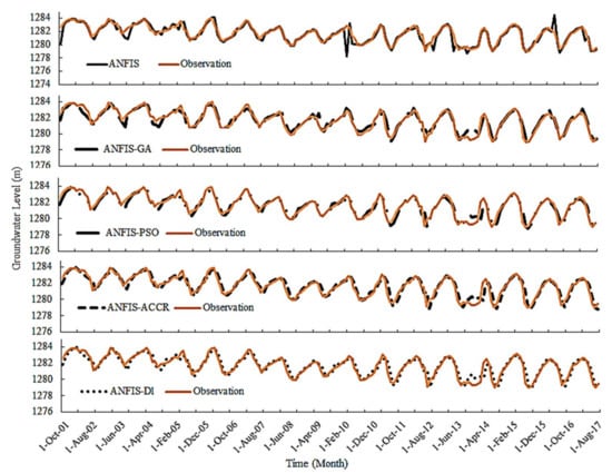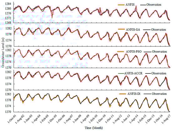 The time series for observations and predictions are shown in Figure 9. Similar to the results of observation well P1, the scatter plot of the ANFIS model indicated less accuracy (R2 = 0.71), while the hybrid models had an acceptable prediction performance, especially the ANFIS-ACOR hybrid model (R2 = 0.97). Therefore, input pattern Q, which includes all variables, is capable of predicting the GWL in the observation wells near the rivers with appropriate accuracy using the ANFIS-ACOR hybrid model.