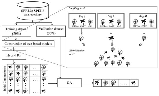 Despite the high performance of RF to solve classification problems, it has difficulties modeling highly nonlinear hydrological processes []. In addition, many trees can make the algorithm too slow and ineffective for real-time predictions. To tackle these drawbacks, a hybrid RF model improved by GA, called GARF, was suggested in this study. Inspired by the study of [], GARF uses a hybrid RF in which three different types of DT, including C4.5, classification, and regression tree (CART), and REPTree are used for random tree generation (Figure 2). These DT types use specific feature splitting criteria—namely, normalized information gain, attributed value test, and plain information gain. The out-of-bag technique is used to minimize the regression error at each bootstrap. The best tree at each bag is selected to be combined as the forest member. The solution is a hybrid RF that is considered a pool of effective trees (inputs) to be optimized by GA. To this end, the initial population of genes (trees) is randomly selected to create random chromosomes (forest). Thus, a chromosome may encompass repeated genes. GA operations (mutation, one-point crossover, and reproduction) are then implemented using initial chromosomes, and then the chromosome with utmost fitness at the validation dataset is considered the best forest. It is worth mentioning that RFs and GA are trained and validated with different inputs and target series but have identical fitness functions (i.e., root mean square error (RMSE)). While RFs are trained and tested using historical SPEI series (the first 70% of observations), GA is trained by hybrid RF chromosomes and validated by the last 30% of the SPEI series. As a result, GARF ascertains optimal solutions and guarantees a generalization capability model. If several chromosomes exhibit identical performance, the one with a lower number of genes deserves to be selected for the parsimony concept.