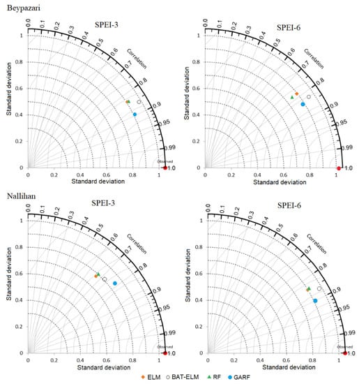 The results of drought prediction were also analyzed by the Taylor diagram in both stations (Figure 4). Generally, all models provided better ability in SPEI-6 prediction in the Nallihan station, as the models’ performance ranged between the correlation of 0.8 to 0.91. Although the weakest SPEI prediction is related to SPEI-3 in the Nallihan station, as shown in Figure 4, all predictor models are far from observed drought (red point) and are located between the correlation range of 0.65 to 0.79. In all cases, GARF (blue point), followed by Bat-ELM (black ring), is the closest model to the observations (red point) and, therefore, superior to the standalone ELM and RF. In addition, the results of ELM and RF models are closer to each other in almost all models, implying that they have the same accuracy in our case studies. Distance of the proposed GARF model from its counterparts proves its ability as a new hybrid model for enhancing the potential of classic RF models for meteorological drought prediction.