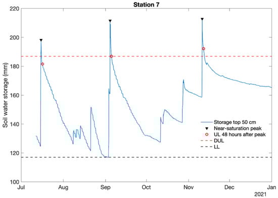 Example for station 7 illustrating near-saturation points, 24-h storage following near-saturation peaks, the drained upper limit (DUL), and the lower limit. All parameters were derived directly from the time series of soil water storage in the top 50 cm of the soil profile.