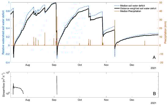(A) Hourly relative soil water deficit and precipitation for the Kings Creek watershed for the period 12 July to 31 October 2021. (B) Hydrograph showing hourly streamflow recorded by gauge # 6879650 managed by the United States Geological Survey. Hours without observations correspond to baseline streamflow below the detection limit of the streamflow gauge.
