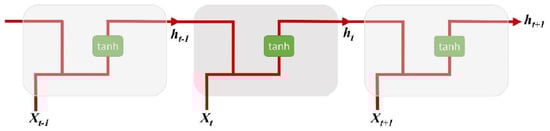 where xt is the input at time t, ht is the hidden neuron at time t, U is the weight of the hidden layer, and W is the transition weights of the hidden layer. The input and previous hidden states are combined to produce information as the current and previous inputs go through a tanh function. Then, the output is the new hidden state, performing as the neural network memory because it holds information from the previous network. Training regular RNNs results in a series of vanishing and exploding gradient problems. In the case of the exploding gradient, the problem is resolved after backpropagation, which is closed at a certain point. However, the results may not be optimal because all the weights are not updated. In the case of the vanishing gradient, it can be adjusted by initializing the weights to reduce the possibility of a vanishing gradient [24].