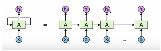 RNN models (see Figure 4) in particular are designed to analyze sequential data. They have been successfully used in fields such as speech recognition, machine translation, and image captioning. RNN processes sequence data by elements, and they preserve a state to represent the information at time steps. The traditional neural network assumes that all units of the input vectors are independent. Accordingly, the traditional neural network is ineffective for prediction when using sequential data. The architecture of RNNs comprise three main components (input, hidden neuron, and activation function). The previous hidden state (ht) can be formulated as