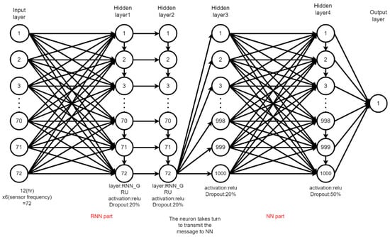The architecture of our RNN2 model was built based on a neural network framework, and it is shown in Figure 7. There is one input layer of neurons and one single output of neurons. Four hidden layers are constructed for computation. Two parts are constructed as (a) RNN2 parts and (b) NN parts. A total of 72 inputs of the neuron are set up to receive the signal of the water quality, considering the turbidity. Layer 2 is the hidden layer, and the received neurons of this layer take turns to transmit the data to the NN part of the system. There are 72 input neurons of 12 h, with each hour taking 6 sampling rates. We selected four hidden layers, and the first two are in the RNN part and the last two are connected to the NN part. To accelerate and consider the convergence speed of the network, we decided to use the same number of neurons as in the input layer. The rectified linear unit (ReLu) was used as the activation function, which is used in the calculation of the core of the NN and RNN systems. Since the ReLu converts all the negative and zero input values to zero, using ReLu as an activation function for RNN2 is a legitimate concern. Srivastava et al. [31] suggested dropout to feedforward neural networks and RBMs and noted the probability of dropout being around 0.5 for hidden units and 0.2 for inputs, which worked well for a variety of tasks. There is a dropout ratio of 20%, which was set up in the first three layers. The last hidden layer was set up for 50% to accelerate the convergence of iterations.