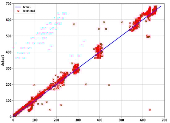 This study collected the training data in October 2019. The RNN2 model was built for two different cases of (a) accumulated rainfall corresponding to 0 and (b) accumulated rainfall greater than 0. The training dataset comprises 0.7 of the entire dataset, and the remainder is used as the testing dataset for the self-testing of the model. Figure 8 presents the prediction error distribution diagram.