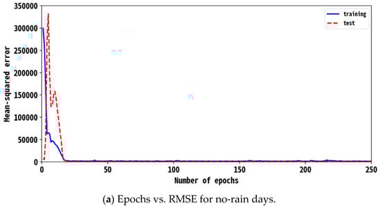 RNN2 converges quickly, which is illustrated in Figure 9a for the case of no-rain days. It varies dramatically at the initial stage. The accuracy becomes stable at 16 epochs. The RMSE of the training dataset descends from 300,000. The test data move downward after the fifth epoch. Figure 9b shows the case of no-rain days of RMSE vs. epochs. The network converges at 14 epochs. The variations in Figure 9a,b are very similar.
