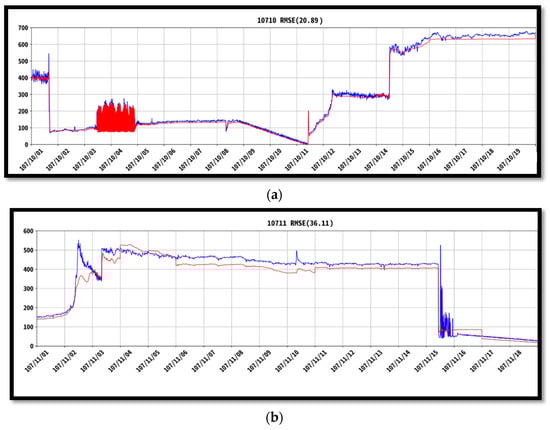 Time–history difference between real (blue) and predicted (red). (a) Time–history of October for building of RNN2 model; (b) time–history of November for predicting of RNN2 model.