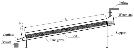 The experiments were carried out at the Soil and Water Conservation Engineering Laboratory, Northwest A&F University, Shaanxi Province, China. A rectangular flume (6.0 m long, 1.0 m wide, and 0.3 m deep) was used in the experiments in the present study. The flume was divided into two parts in the longitudinal direction by a glass wall located at the flume’s centerline, so that two replicate experiments could be run simultaneously. The flume walls and bed were made of toughened glass fixed with metal rods. A hydraulic jack located under the flume allowed for the adjustment of the slope gradient (0–15°). The lower 0.05 m of the flume was filled with natural fine gravel (2–4 mm), and a 0.2 m thick layer of soil was placed on top of the gravel (Figure 1).