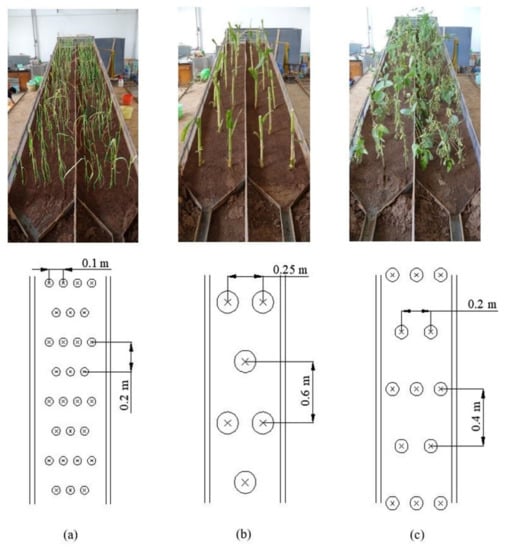 Three crops were tested in the experiments, namely, millet (Setaria italica. cv. “Jingu29”), maize (Zea mays L. cv. “Zhengdan 958”), and soybean (Glycine max (Linn.) Merr. cv. “Zhonghuang 13”), which are the dominant crops on arable land in the Loess Plateau. The crops were planted in the experimental flume after cultivation. To ensure consistency with normal planting density, we drilled millet, maize, and soybean seeds into soil with row spacings of 0.2 m, 0.6 m, and 0.4 m, respectively, and plant spacings of 0.1 m, 0.25 m, and 0.2 m, respectively (Figure 2). Moreover, a no-tillage treatment, a macroscopic bare soil surface without any vegetation cover, was set up as a control (CK) to investigate how the root systems of different crops influence soil detachment.
