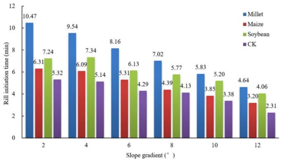 The rill initiation time under different crops cover versus slope gradient with a unit discharge of 0.1 L m−1s−1.