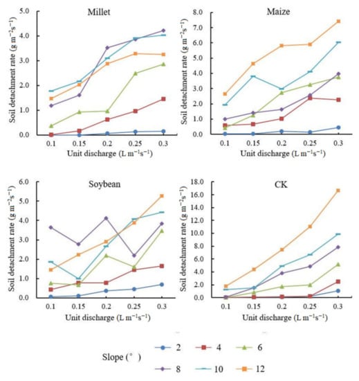 Slope gradient and unit discharge rate are two key variables that influence soil detachment. Table 5 lists the detachment rates under different crop covers with different slope gradients and unit discharge rates. Soil detachment rates among different crop covers were significantly different (p < 0.05) under different slope gradients and unit discharge rates. Figure 5 illustrates how the two parameters influence soil detachment rate under different crop covers.
