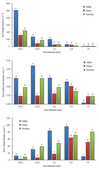 The root length densities of millet, maize, and soybean were the maximum in the 0–0.5 mm root diameter range, accounting for 65.4%, 61.9%, and 62.3% of the total root lengths, respectively. In addition, root length density was inversely proportional to root diameter in all three crops. Most crop roots were fine roots, with a root diameter of 0–0.5 mm. RSAD first increased and then decreased with an increase in crop root diameter. Specifically, millet RSAD was the largest (0.44 m2 m−3) in the 0.5–1 mm root diameter range, accounting for 33.6% of the total root surface area, and the smallest in the >5 mm root diameter range, accounting for 1.1% of the total root surface area. Soybean RSAD trends were largely consistent with those of millet, with the maximum (0.29 m2 m−3; 32.2%) in the 0.5–1 mm root diameter range, and the minimum (0.09 m2 m−3; 9.8%) in the range >5 mm root diameter range. In the case of maize, RSAD was the largest (0.21 m2 m−3; 34.3%) in the 2–5 mm root diameter range; nevertheless, the RSAD was not significantly different from those in other diameter intervals. In addition, RVD in both millet and maize increased first and then decreased with an increase in root diameter. RVD of millet in 2–5 mm root diameter range was the largest (96.04 cm3 m−3), accounting for 41.5% of the total volume, and the smallest in the >5 mm root diameter range, accounting for 4.4%. The largest RVD in maize (63.78 cm3 m−3; 45.1%) was observed in the 2–5 mm root diameter range, and the smallest (8.61 cm3 m−3; 1.7%) was observed in the 0–0.5 mm root diameter range. Unlike millet and maize RVDs, soybean RVD increased exponentially with an increase in root diameter, and the maximum in the > 5 mm range was 80.94 cm3 m−3 (32.6%), whereas the minimum in the 0–0.5 mm range was 17.22 cm3 m−3 (3.5%).