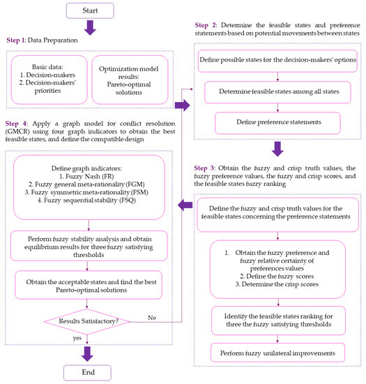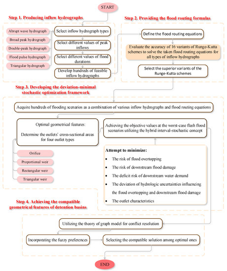 The presented framework included four substantial steps for the optimal compatible design of detention basins using the NSGA-III optimization algorithm, based on the Runge-Kutta method, considering the CVaR and NINP methods for uncertainty assessments and GMCR compatibility, to verify the approach, as illustrated in