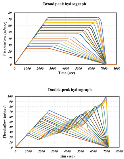 In this study, one hundred inflow hydrographs, 20 of each type, were generated by variations in peak inflows and flood durations to improve the model’s reliability in field conditions (
