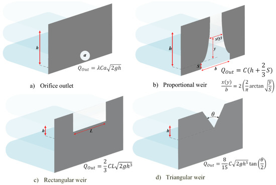 The schematic view and outflow equations for the four selected outlet types: (a) Orifice; (b) Proportional weir; (c) Rectangular weir; (d) Triangular weir. Qout, outflow from the outlets/weirs; h, hydraulic head of stored water; λ, formula error correction factor; C, outlet coefficient; a, total cross-sectional area of the orifice outlet; b, weir constants; S, weir base distance; x(y), weir width at water surface; y, water depth; L, weir width; θ, weir tip angle; g, gravitational acceleration constant.