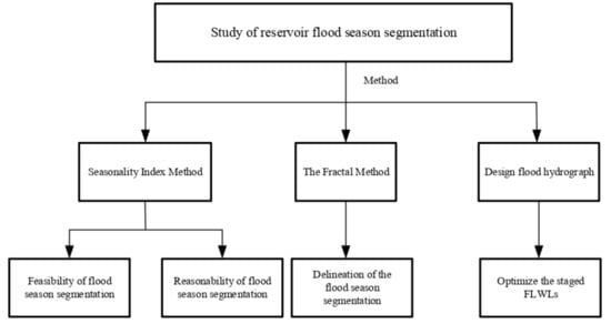 Therefore, the novelty of this study is to overcome the above difficulties by using the and to address the following three objectives: (1) A Seasonality index method is used to evaluate the feasibility of flood season segmentation. (2) A Fractal method for flood staging is employed, using a comparative study of the seasonality indexes before and after dividing the entire flood season to inspect the reasonableness of the flood season segmentation results. (3) A design flood process method to optimize staged flood FLWLs. A multi-purpose reservoir, the Longtan Reservoir, China, is picked as a case study. The research flow is shown in Figure 1.