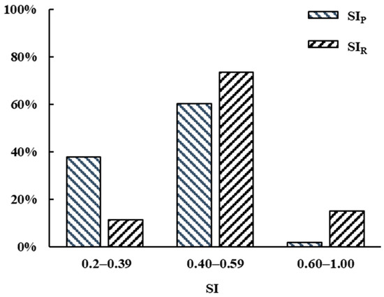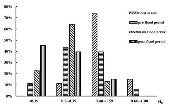 We aimed to compare the changes of the and before and after the flood segmentation to quantitatively analyze the reasonableness of the staging results. The percentage of each level of the and before and after flood segmentation are shown in Figure 4, Figure 5 and Figure 6. As illustrated in Figure 4, before the flood segmentation, more than 60% of the years show a significant seasonal characteristic and the and range from 0.40 to 0.59. Besides, no year indicates that the rainfall or runoff is evenly distributed during the flood season ( and ). For (Figure 4), after the flood segmentation, the values have significantly decreased. The percentage of the years with is 51%, 95%, and 73% in the three sub-flood periods, respectively. Moreover, the percentage of the years with is 15%, 40%, and 47% in the three sub-flood periods, respectively, implying that the segmentation of flood season has weakened the seasonal characteristics of rainfall. For (Figure 5), after the flood segmentation, the values have also significantly decreased, the percentage of the years with are 54%, 87%, and 85% in the three sub-flood periods, respectively. Moreover, the percentage of the years with are 11%, 23%, and 45% in the three sub-flood periods, respectively, implying that the segmentation of flood season has weakened the seasonal characteristics of runoff. In summary, the staging of the flood season allows the seasonal characteristics of rainfall and runoff to be reduced, resulting in a more uniform and consistent distribution of rainfall and runoff within each sub-flood season, so the staging results are reasonable.