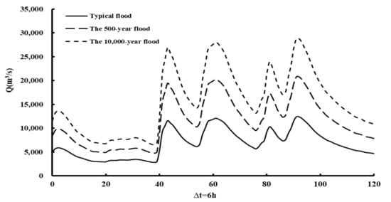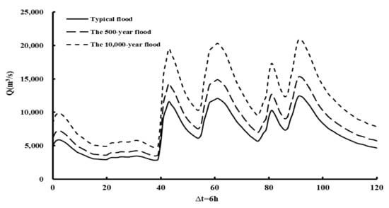 Finally, the 500-year and 10,000-year design flood hydrographs of the three sub-flood periods are derived by using the same ratio amplification method, and the results are shown in Figure 7, Figure 8 and Figure 9.
