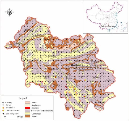Guizhou Province is located in the southwest of China. Hezhang County, a typical mineral county in Guizhou Province, is the study area. The GSLQ Project shows that the county has the highest concentration of HMs in the soil of Guizhou Province. There are 18 large lead-zinc mines and iron mines, and the old-fashioned activities of zinc smelting have lasted for many years, and with high ecological risk. The emissions of Cd and Zn in the study area are high [43], and the concentration of Pb and Zn in corn grain exceed the national food limit value [44], which poses potential ecological risks to human health. However, the pollution level and ecological risk in the study area is unknown, and the boundary of ecological risks is unclear, so it is urgent to carry out soil pollution and ecological risk assessment. The three main objectives of this study were (1) to investigate the concentration distribution of HMs in topsoil in Hezhang County, (2) to analyze the potential source of pollution and quantify their contributions using the PMF model combined with geological background, mining activity, and land use investigation, and (3) to assess ecological risks through the distribution and potential sources of HMs. This research elected Hezhang County, with its high geological background and mining activity dual risk, as a case study, and will provide information on how the relationship between ecological risks and geological background, parent materials, mining activity, will ensure food security.