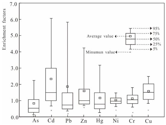 The enrichment factors (EFs) of heavy metals in topsoil.