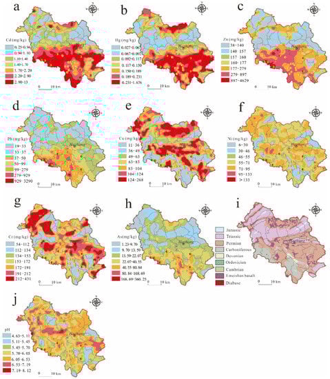 Spatial distribution of (a) Cd, (b) Hg, (c) Zn, (d) Pb, (e) Cu, (f) Ni, (g) Cr, (h) As, (j) pH, and (i) geological map of study area. Note: in study area, Late Permian Emeishan formation is dominated with greyish-green dense, amygdaloidal basalt, and other formations are mainly composed of limestone and dolomite.