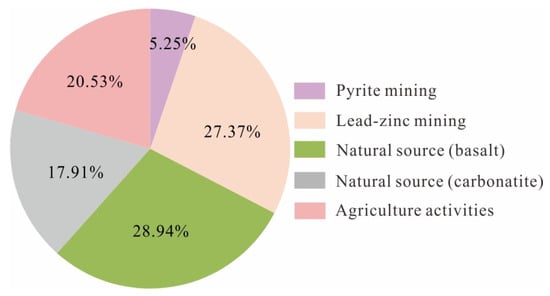 Based on the above discussion, there are five sources of HMs in Hezhang County, namely pyrite mining, lead-zinc mining, natural source (basalt), natural source (carbonate), and agriculture production. The risk contribution ratios of the five sources of HMs are 5.25%, 27.37%, 28.94%, 17.91%, and 20.53%, respectively (Figure 4). Both pyrite mining and lead-zinc mining are industrial emissions, which was consistent with the fact that mining is a pillar industry in Hezhang County, and the total risk contribution ratio was 32.62%. Both factor 3 and factor 4 could be defined as natural sources, which coincided with the distribution of parent rocks, and the total risk contribution ratio was 46.85%. Factor 5 mainly comes from agricultural production, as agriculture is a pillar industry in the study area.