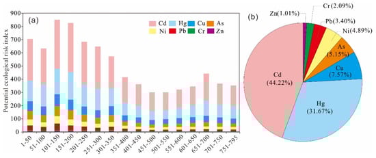 Total potential ecological risk assessment of HMs in the sampling sites (a), and the contribution of HMs to potential ecological risks (b).