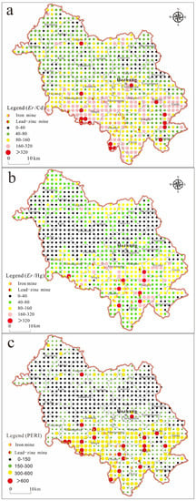 Spatial distribution of potential ecological risks of Cd (a), Hg (b) and eight heavy metals (c) in study area.