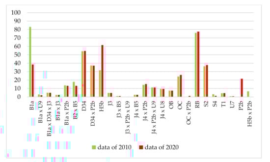 The main difference in habitats between the two maps is that there are two different complexes. On the 2010 map, we can find the H5b × P2b complex, which is noticeably separated by 2020. Therefore, for the year 2020, H5b and P2b were recorded separately. In both years, only seven categories (B1a × D34 × J3, J3, J3 × P2b × U9, J4 × B5, J4 × P2b × U9, J4 × U8 and U7) were presented entirely, thus most of the complexes were transformed. The map made in the wetter year (2010) shows the decreasing trend of the aquatic vegetation in low-lying woodless habitats. A significant change occurred in the closed sand steppes (H5b) and the aspects of their subtypes, too. They went through a total transformation and their presence was lower in 2010 than in 2020. Their area was 70.4 hectares in 2010, then it increased to 145.5 hectares in 2020. According to the maps, the vegetation changed significantly in the compared years, under extremely dry conditions (2020) and in the extremely wet year (2010). The two examined years’ vegetation showed a huge difference, which appropriately indicated the environmental changes. The extension of grassland increased significantly. Areas of closed sand steppes (H5b) increased due to the presence of persistent rainfall shortages, the number of plots extremely increased from 6 (in 2010) to 14 (in 2020). To sum up, it can be observed that the presence of dry habitats increased and several dry fragments were formed within 10 years (Figure 3).