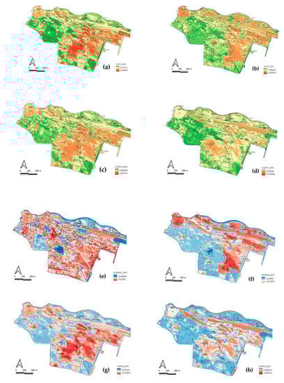2020 and 2021 habitat map with coloring based on the selected values—(a) NDVI_2020, (b) GNDVI_2020, (c) NDWI_2020, (d) MNDWI_2020, (e) NDVI_2021, (f) GNDVI_2021, (g) NDWI_2021, and (h) MNDWI_2021.