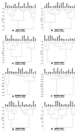 UPGMA cluster analysis of vegetation indexes—(a) NDVI_2020, (b) NDVI_2021 (c) GNDVI_2020, (d) GNDVI_2021, (e) MNDWI_2020, (f) MNDWI_2021, (g) NDWI_2020, and (h) NDWI_2021.