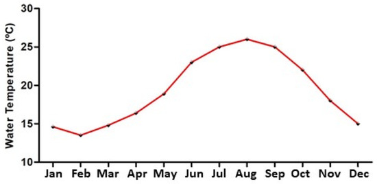 We performed simulations of the gross and temporal pattern waste output produced by GHSB farming in the form of total carbon (TC), total nitrogen (TN), and total phosphorus (TP) under two scenarios: (S1), stepped fish input, and (S2), all in/all out with a fallowing period of 8 months. We performed simulations for an annual production of around 1500 tons over a 4-year time period. The sizes of feed pellets based on the weight range of the fish are presented in Table 1, as are their content in TC, TN, and TP, ADC values, fish carcass composition [36], and other simulation conditions. To compare both strategies, gross waste output was estimated on a yearly basis for the duration of a full production cycle starting in April once production was stabilized. In S1, four fish inputs are carried out sequentially throughout the year. Fish of different ages (size) are therefore present within the farm at any given time. The dates of fish entry—four per year—were set according to a schedule resembling the Mediterranean GHSB stock management farming conditions [37]—i.e., in April, June, August, and September for a culture length of 16, 15, 15, and 17 months, respectively—predicted according to Mayer et al. [33]. The temperature regime is shown in Figure 1. In this system, the fish are harvested sequentially as different batches reach commercial size (500 g mean final weight). In S2, all of the fish needed to reach the required production quota enter the farm on the same date (in April). A fallowing period of 8 months was set between harvest and the following entry in April and was set within 2 years from the previous input date. At the end of each production cycle, all of the fish are harvested upon reaching commercial size.