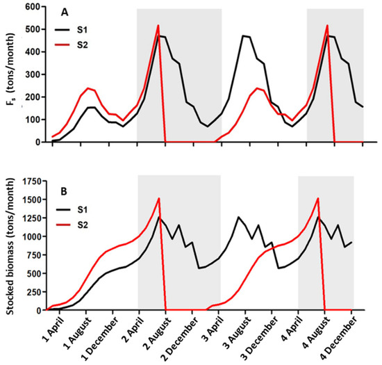 The simulations of both strategies started at the beginning of the farming period (April year 1). Table S1 (in Supplementary Materials) shows the evolution of the biomass of the different batches, the biomass harvested at the end of each production cycle, and the cumulative biomass of both strategies. These simulations show that the Fs and stocked biomass (Figure 2A,B) increase gradually in both strategies. However, both the Fs and stocked biomass are higher in S2 up until the end of the first production cycle (end of July year 2). At this point, all of the stock is harvested in S2, while only a quarter of the stock is harvested in S1. In the following 8 months (August year 2 to April year 3), the Fs and fish biomass equal zero in S2 because of fallowing; In S1, the Fs and fish biomass ranges are 70–465 and 570–1150 tons/month, respectively, with ups and downs resulting from the successive fish inputs and harvests that are characteristic of this strategy during this period. Once production stabilizes in S1 (from year 2), Fs remains within the range of 70–470 tons month−1 indefinitely, and stocked biomass stays within the range of 570–1260 tons month−1, provided that the fish input and harvesting schedule are maintained within the simulation conditions. In S2, the stocked biomass increases from 60 tons on the fish-input date to a final biomass production of 1500 tons 16 months later; the Fs increases from 25 to 517 tons/month and follows the temporal patterns shown in Figure 2A,B.