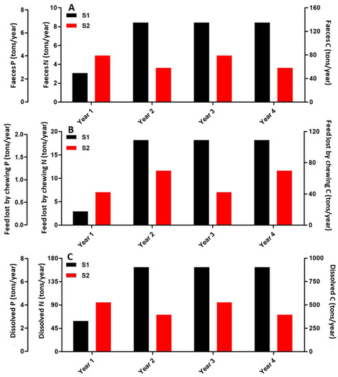 Regarding particulate waste, the most abundant waste fraction differs depending on the nutrient, but regardless of the farming strategy (Figure 3A,B), there is more C and P waste in F (S1: 141 and 7 tons/year of C and P, respectively; S2: 79 and 3 tons/year of C and P, respectively) than in Fch (S1: 111 and 2 tons/year of C and P, respectively; S2: 71 and 1 tons/year of C and P, respectively), whereas the opposite is true for N waste, with Fch experiencing more N waste (S1: 18 tons/year of N; S2: 11 tons/year of N) than F (S1: 8 tons/year of N; S2: 5 tons/year of N). In year 1, the differences between S1 and S2 are particularly noticeable for the three nutrients in Fch, with S2 having concentrations that are about 60% higher (Figure 3B; Table 1).