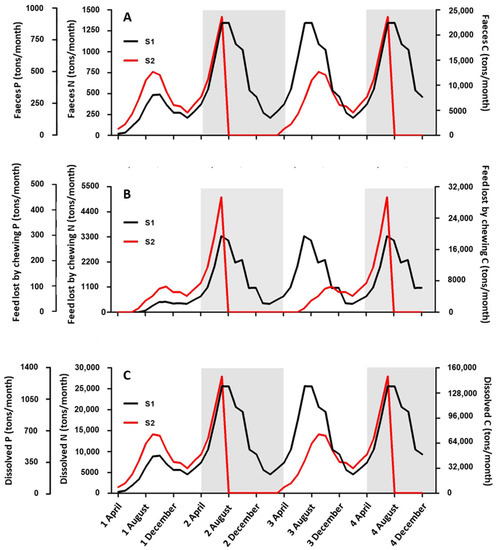 The Simulations revealed a temporal pattern in the waste output (Figure 4A–C) that was related to fluctuations in Fs and in the stocked biomass (Figure 2A,B). Quantitatively, nutrient release was lower in S1 than it was in S2 for all of the waste fractions throughout the first production cycle. The waste output is only higher in S1 than in S2 at the beginning of the fallowing period and at the end of the winter period before the next production cycle in S2. From then on, and during the rest of the second part of the production cycle, waste production is higher in S2 than it is in S1 (Figure 4A–C).